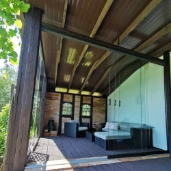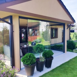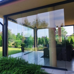 System szyb przesuwnych umożliwia pełne otwieranie przestrzeni tarasu dzięki bezramowym, hartowanym panelom szklanym. To idealne rozwiązanie dla osób, które chcą cieszyć się widokiem na zewnątrz, jednocześnie chroniąc się przed zmiennymi warunkami atmosferycznymi.