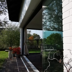 Szklane drzwi przesuwne wykonane są z bezpiecznego szkła hartowanego o grubości 10 mm. Jest to materiał odporny na zmienne warunki pogodowe, co sprawia, że system idealnie nadaje się do zewnętrznych przestrzeni, takich jak tarasy czy werandy.
