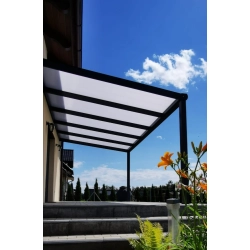 - Szerokość: Zadaszenia zaczynają się od szerokości 3,06 m i mogą być zwiększane co 1 metr. Możliwe jest także przycięcie szerokości do wybranego rozmiaru.